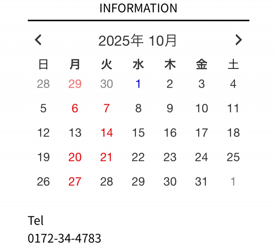 Tel0172-34-4783※お電話でのご予約は19:30まで HoursOPEN 8:30 ~ CLOSED 20:00 Holiday毎週月曜日・第1・3火曜日(祝祭日の場合翌平日振替なります) Address〒036-8021 青森県弘前市和徳町327